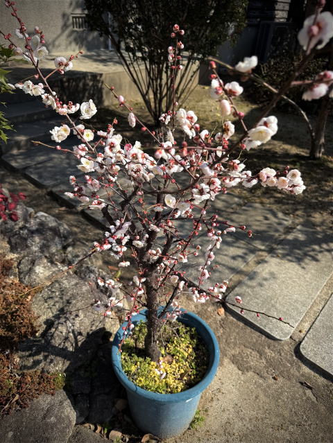 お寺の玄関前に置いている梅が綺麗な花を咲かせました。季節の花に癒やされます。
